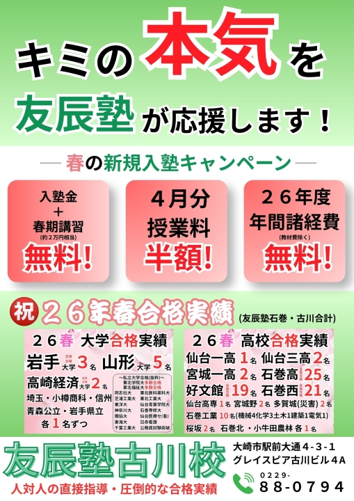 25年4月より友辰塾古川校となり、高校受験・大学受験に対応いたします。